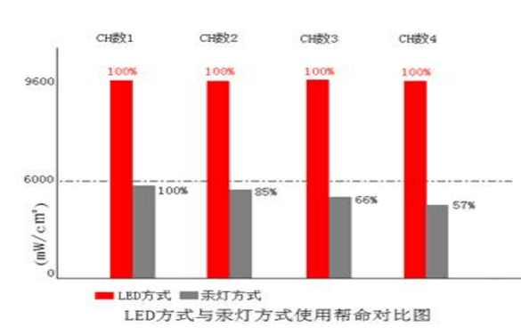 相對于傳統(tǒng)汞燈固化設(shè)備,其汞燈使用壽命只有1000-3000小時,而UVLED固化裝置則達到20000-30000小時,LED可以在需要紫外光時瞬間點亮,按DUIY=1/5(準備時間=5照射時間=1)時,LED方式使用壽命相當于汞燈40倍,減少更換燈管時間,提高了生產(chǎn)效率,同時也非常節(jié)能;而傳統(tǒng)汞燈固化設(shè)備在工作時,由于汞燈需要預(yù)熱,開閉會影響汞燈壽命,所以燈管必須一直點亮,不僅縮短了汞燈使用壽命也造成不必要的電力消耗。